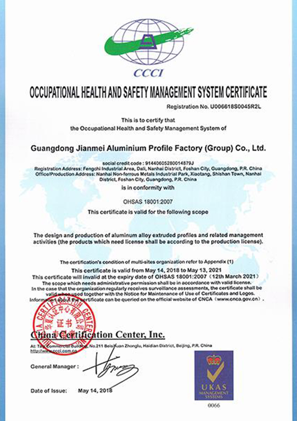 Tháng 8 – 2016, giành chứng nhận hệ thống quản lý an toàn và đạt chỉ tiêu sức khỏe. Sản phẩm nhôm định hình hợp kim phù hợp với tiêu chí OHSAS 18001:2007.